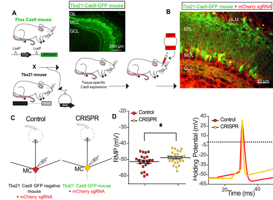 We are exploring how energy homeostasis can be maintained by the olfactory system as a means to prevent diet-induced obesity and unwanted weight gain. I am using CRISPR gene editing and chemogenetics (called DREADDs) to up- and down-regulate output neurons of the olfactory bulb to modulate energy expenditure, adiposity, and weight gain when mice are challenged with a fatty diet. I explicitly used CRISPR to generate a conditional knockout of the potassium channel, Kv1.3, because these proteins regulate neuronal excitability and the resting membrane potential. I developed a technique to retro-orbitally deliver my designed CRISPR sgRNAs in AAV9 viral particles into genetically-engineered mice that express Cas9 in only mitral/tufted cells of the olfactory bulb. I used methodologies such as slice electrophysiology, odor habituation/dishabituation behavior assays, protein biochemistry, serum analysis, histology, and systems physiology (metabolic chambers) to characterize my CRISPR mice that demonstrated improved olfactory & health metrics compared to control littermates. I discovered that my engineered DREADDs mice oppositely demonstrated an obesogenic phenotype. Through my research, I have uniquely discovered that output neurons of the olfactory bulb communicate olfactory coding information and simultaneously participate in metabolic regulation.